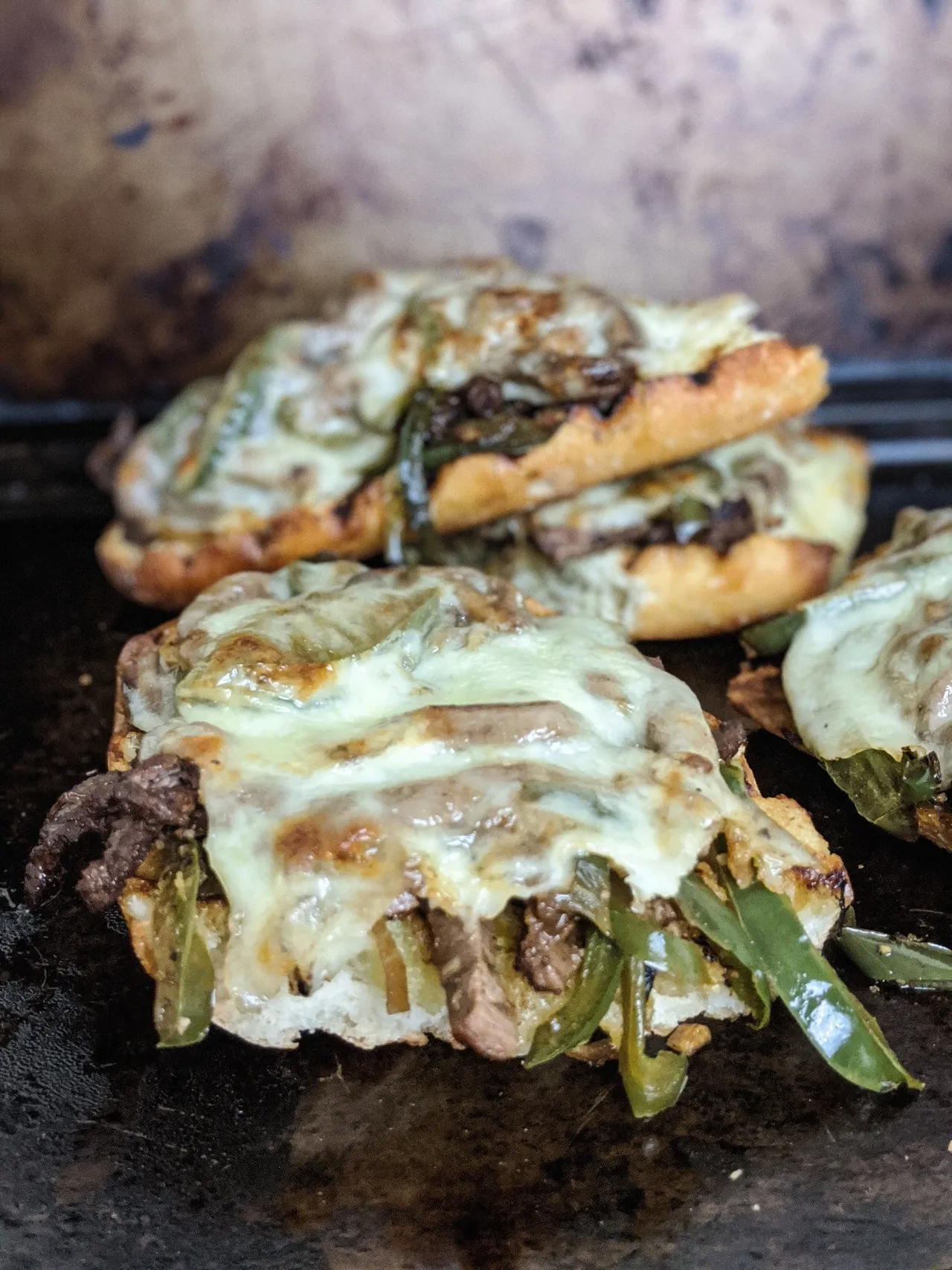 - Déposer les tranches de baguette sur une plaque à cuisson, ajouter le mélange de steak et déposer les tranches de fromage provolone sur le dessus.