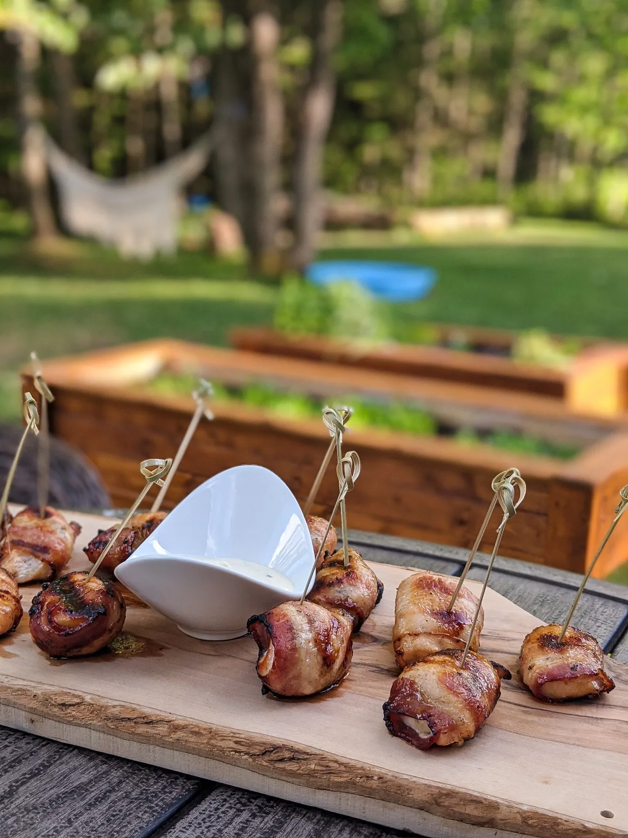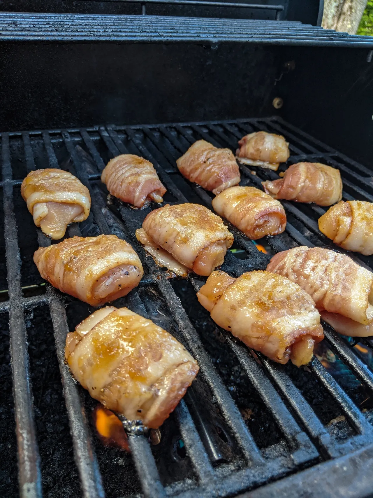 - Déposer les morceaux à feu direct sur le barbecue, puis baisser le feu à moyen-doux afin d'éviter que le bacon ne soit calciné. Cuire pendant 8-9 minutes de chaque côté en les tournant qu'une seule fois en vérifiant quand même que les bouchées ne brûlent pas, si c'est le cas, déplacez vos bouchées à feu indirect avec le couvercle fermé pour terminer la cuisson.