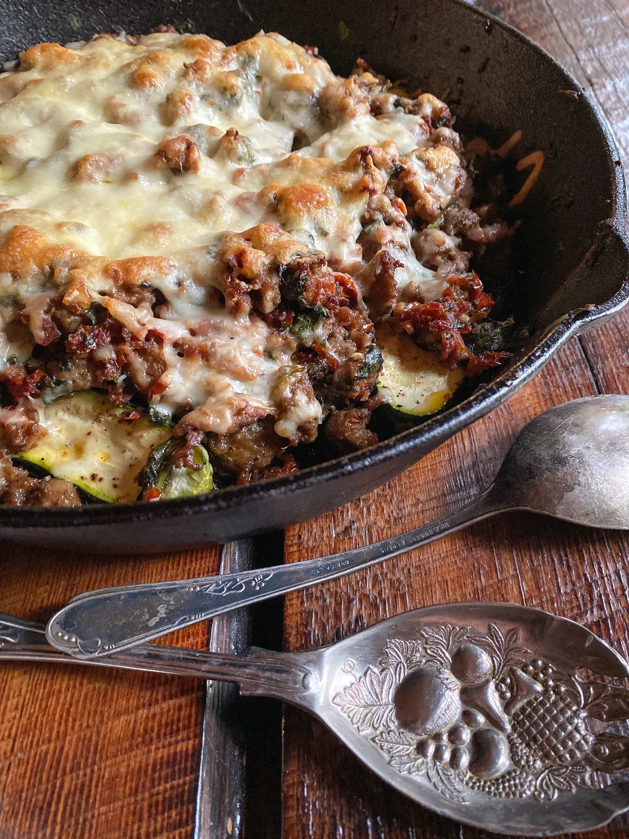 Casserole de courgettes saucisses, tomates séchées et épinards