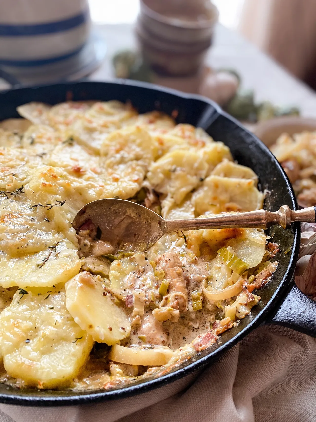 - Déposer les tranches de pommes de terre sur le dessus de la casserole, saler, poivrer, puis ajouter le fromage râpé.