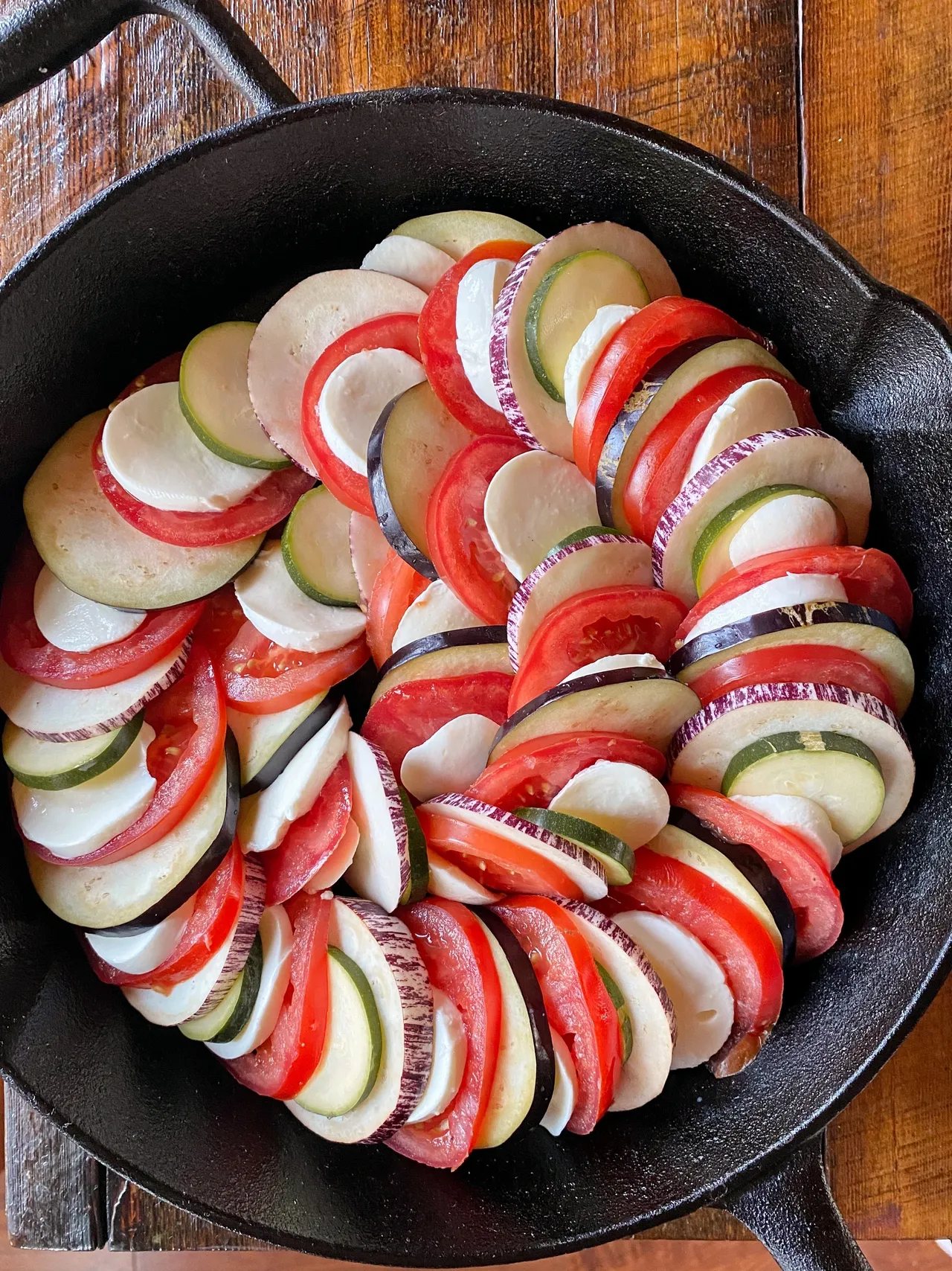 - Dans un plat allant au four, badigeonner l’intérieur avec un peu d’huile d’olive. Déposer une tranche de tomate, une tranche de mozzarella, une tranche d’aubergine, une autre de tomates, puis de mozzarella, une autre d’aubergine, puis une de courgette. Répéter cette série en suivant la forme du plat (voir photo). Saler et poivrer.