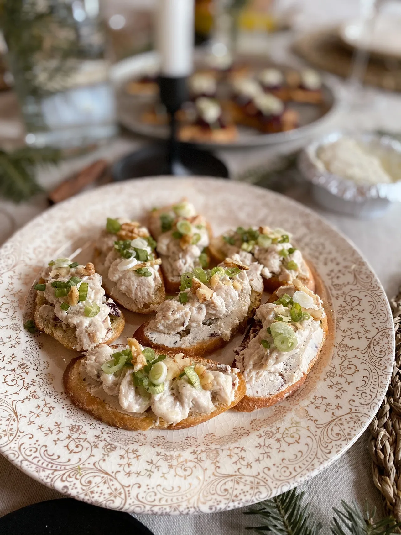 Crostini à la salade de poulet et boursin canneberge et poivre