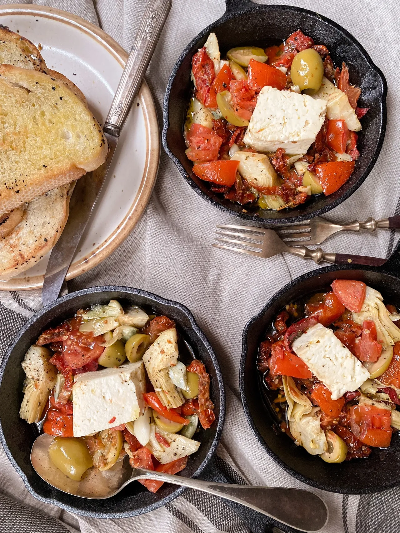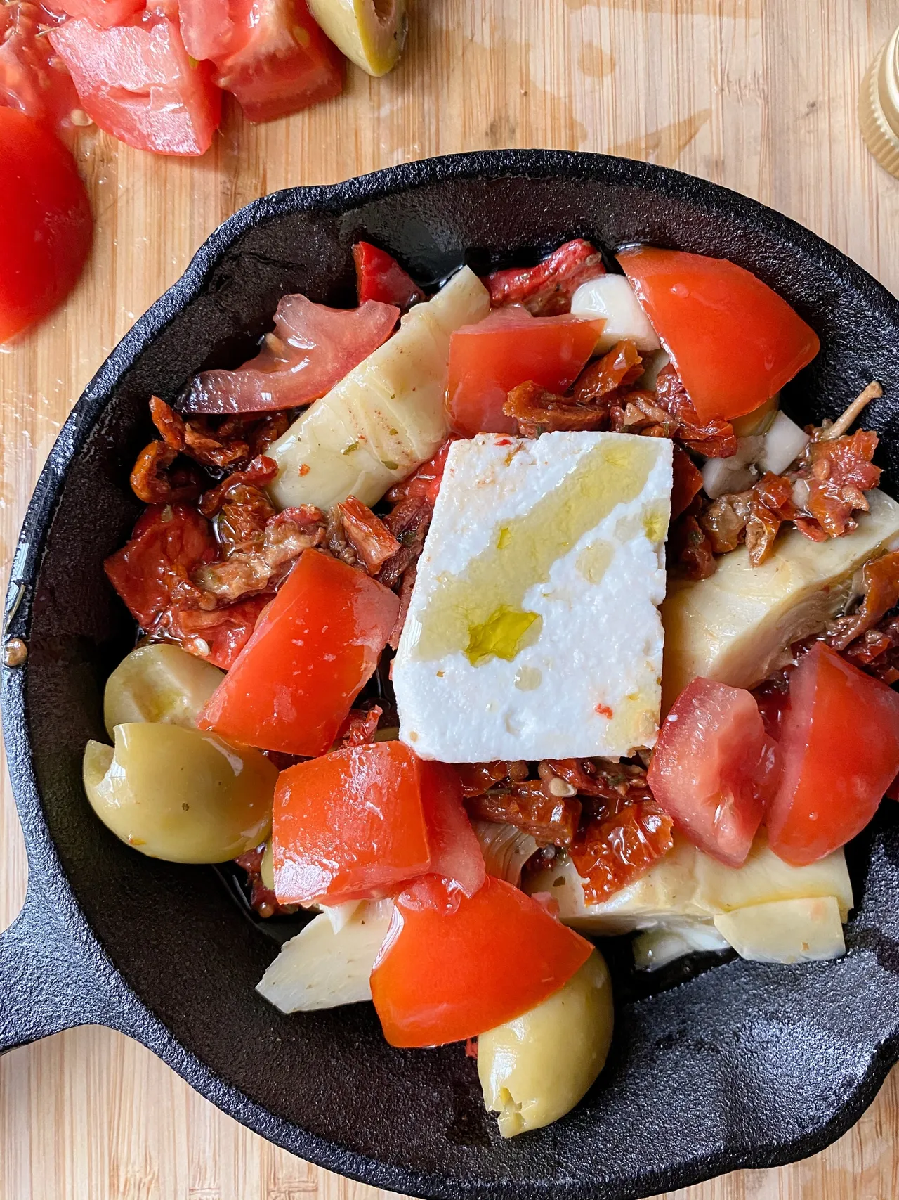 - Déposer les cubes de feta dans des petits plats individuels allant au four.