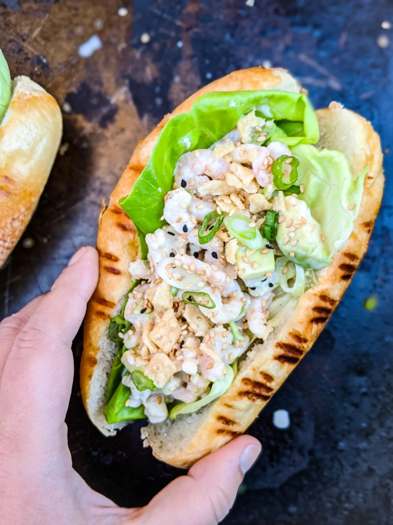 - Lorsque les pains sont prêts, pour chaque guédille, ajouter un peu de mayo, une feuille de laitue, le mélange de crevettes et le crumble de won ton frits.