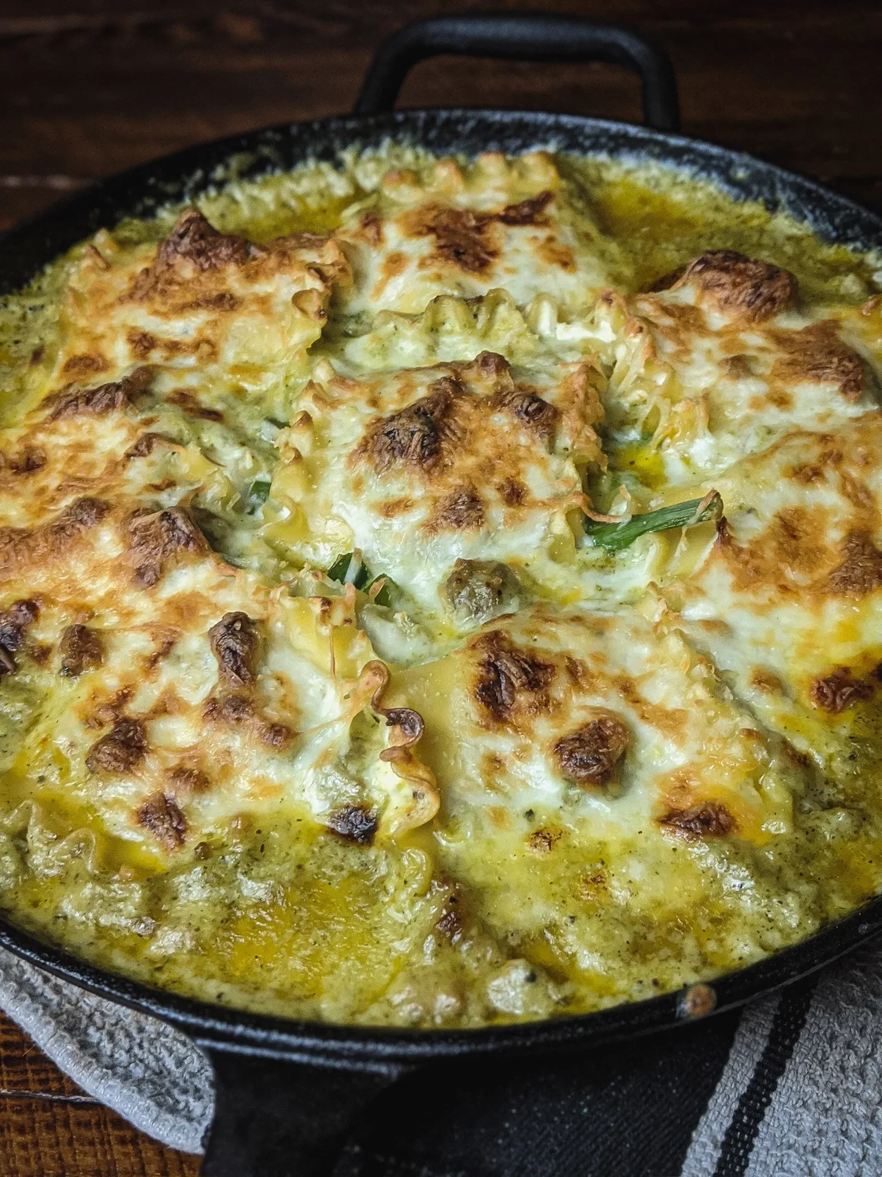 Lasagnes ricotta, asperges, pesto & chaire de saucisse