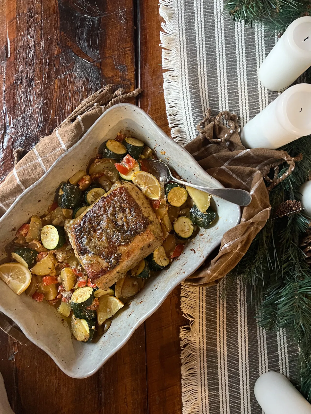- Dans une poêle à feu vif avec un filet d’huile d’olive, saisir la longe de porc 1 minute de chaque côté ou jusqu’à ce qu’elle soit bien colorée. Retirer, puis déposer sur les légumes.