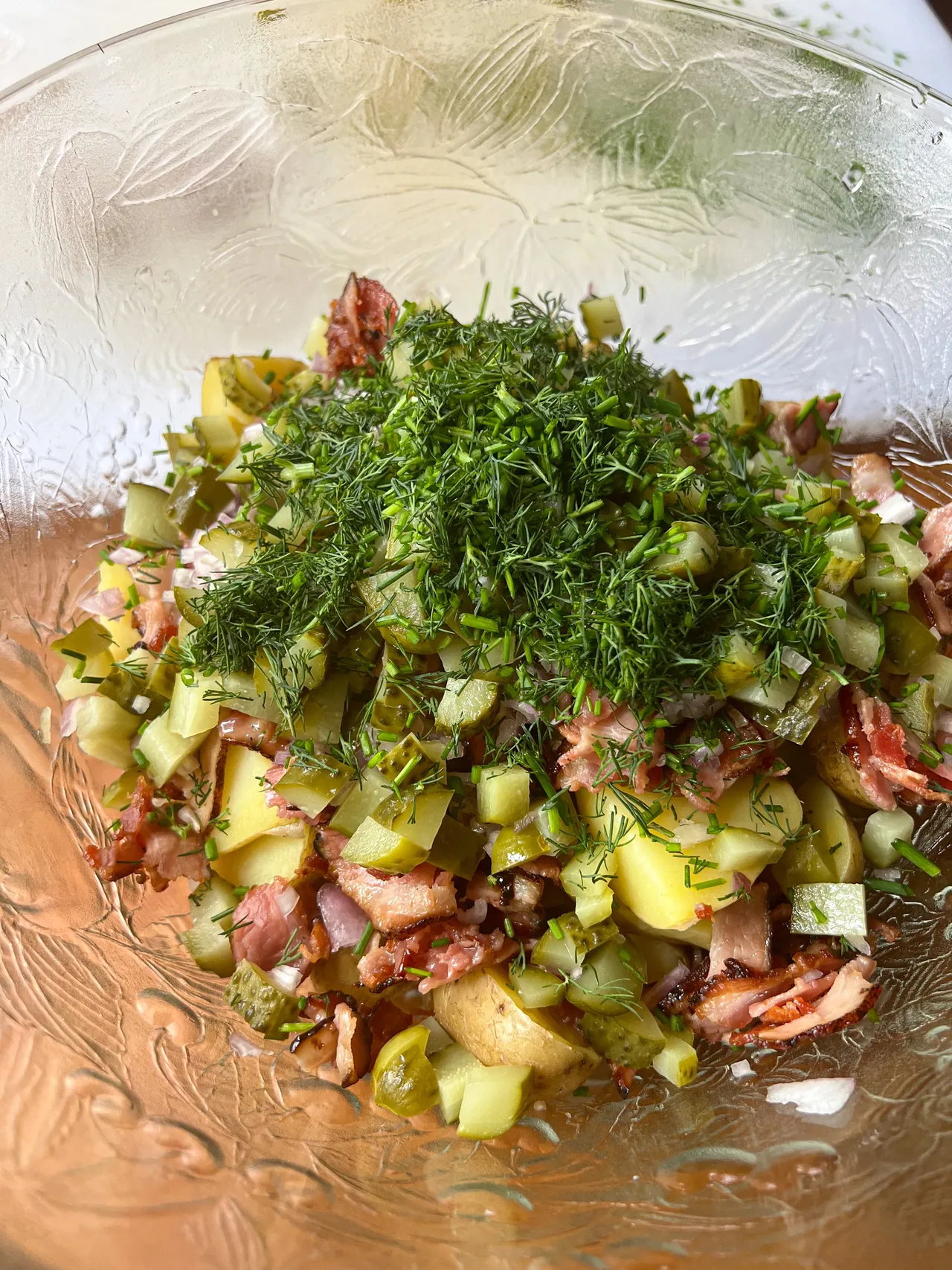 - Lorsque tout est prêt, dans un bol combiner les pommes de terre, le bacon, les cornichons, les échalotes françaises, l’aneth, la ciboulette et la sauce, puis mélanger.