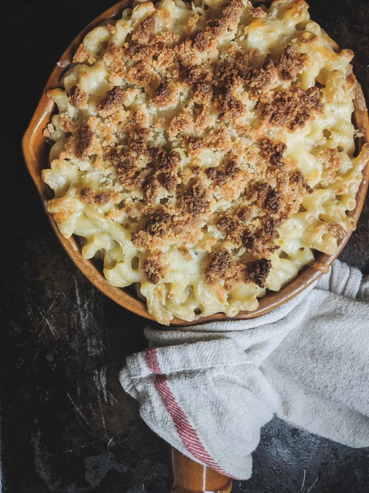 - Avec les mains, mélanger tous les ingrédients de la section “pour le crumble” jusqu’à obtenir une texture sablonneuse et parsemer le macaroni avec ce crumble.