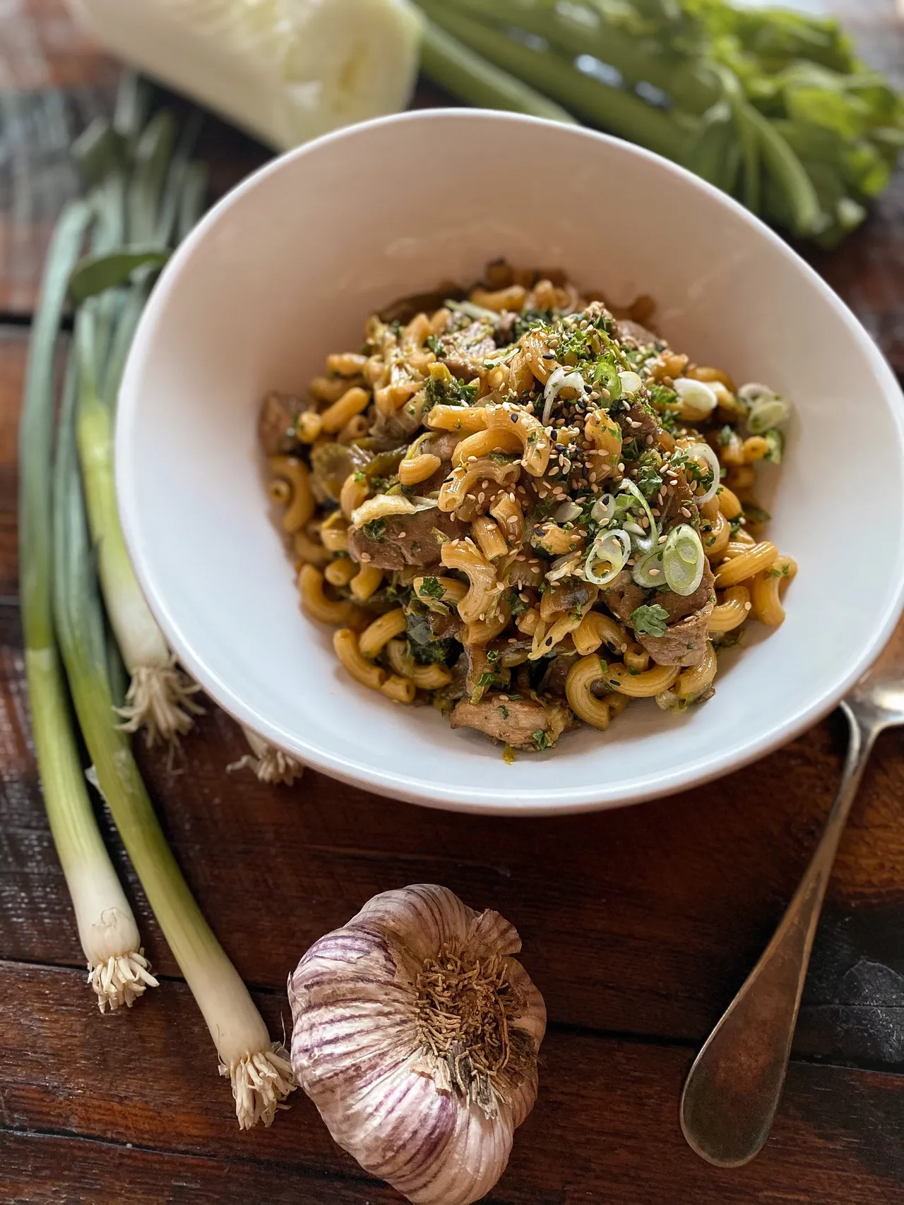 - Quand c’est prêt, mélanger les pâtes avec le mélange de porc et de légume. Ajouter le miel, le persil, les oignons verts, les graines de sésame et l’huile d’olive.