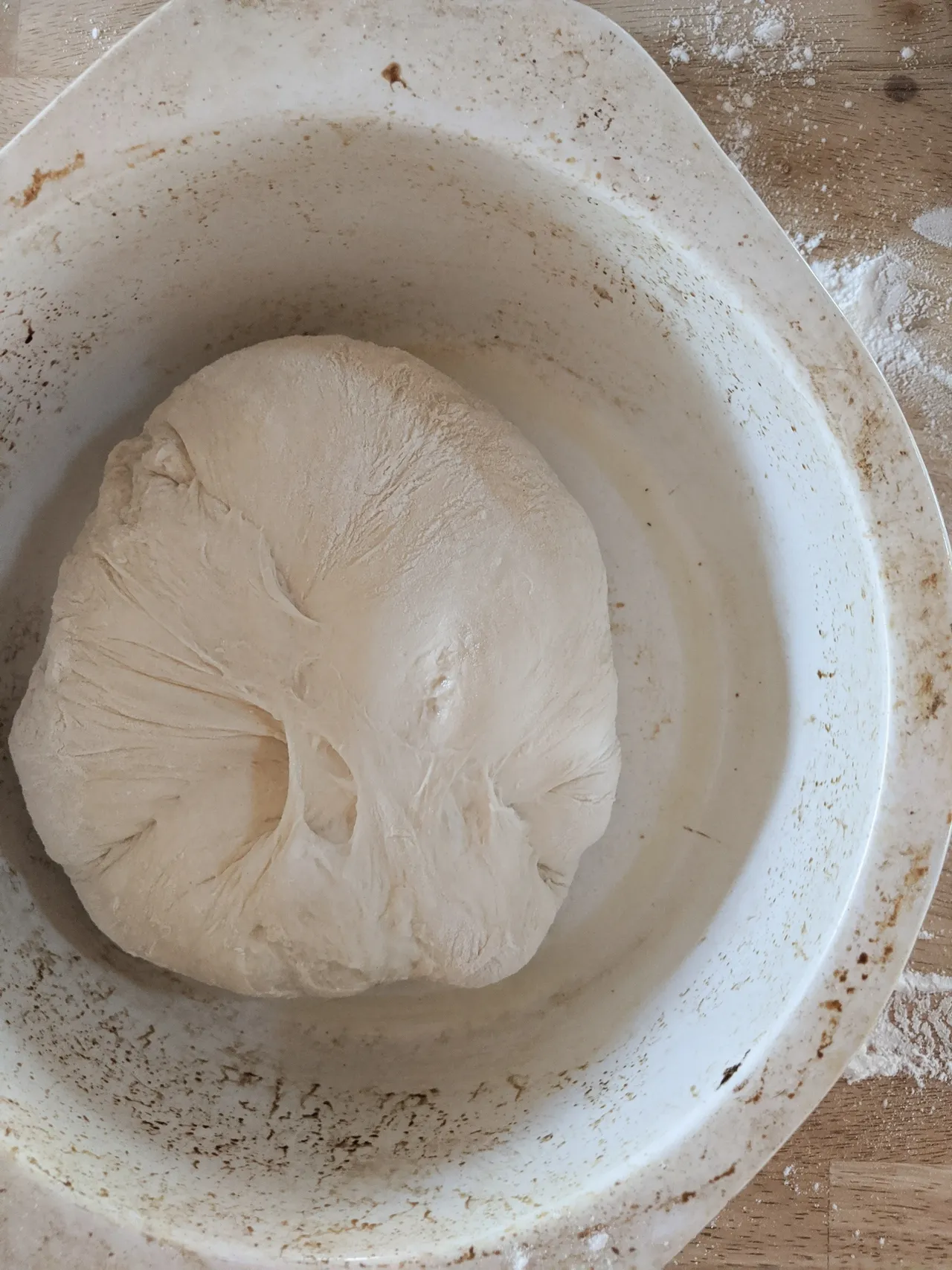 - Le lendemain, la pâte aura pratiquement doublé et vous pourrez bien voir l'effet de la fermentation (de petites bulles se sont formées).