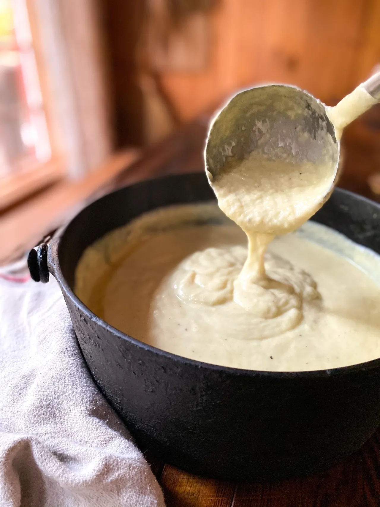 - Transférer tout le contenu du chaudron dans un mélangeur, puis mélanger à forte puissance jusqu’à ce que le potage soit bien lisse. Incorporer la crème, puis mélanger encore jusqu'à homogénéité. S’il n’y a pas assez de place dans le mélangeur, retourner le potage dans le chaudron, puis incorporer la crème.