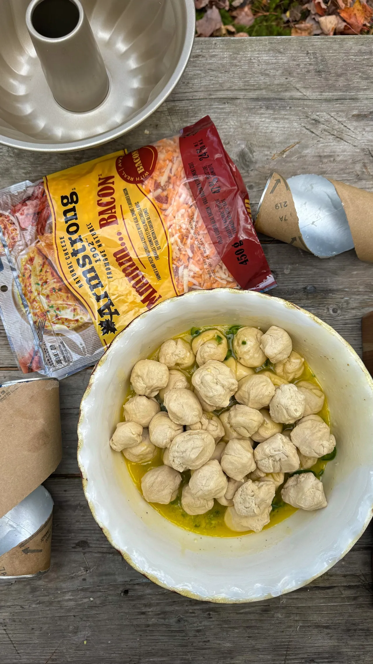- Ajouter le mélange de fromage au bacon, puis mélanger le tout délicatement avec les doigts pour bien enrober les boules de pâtes.