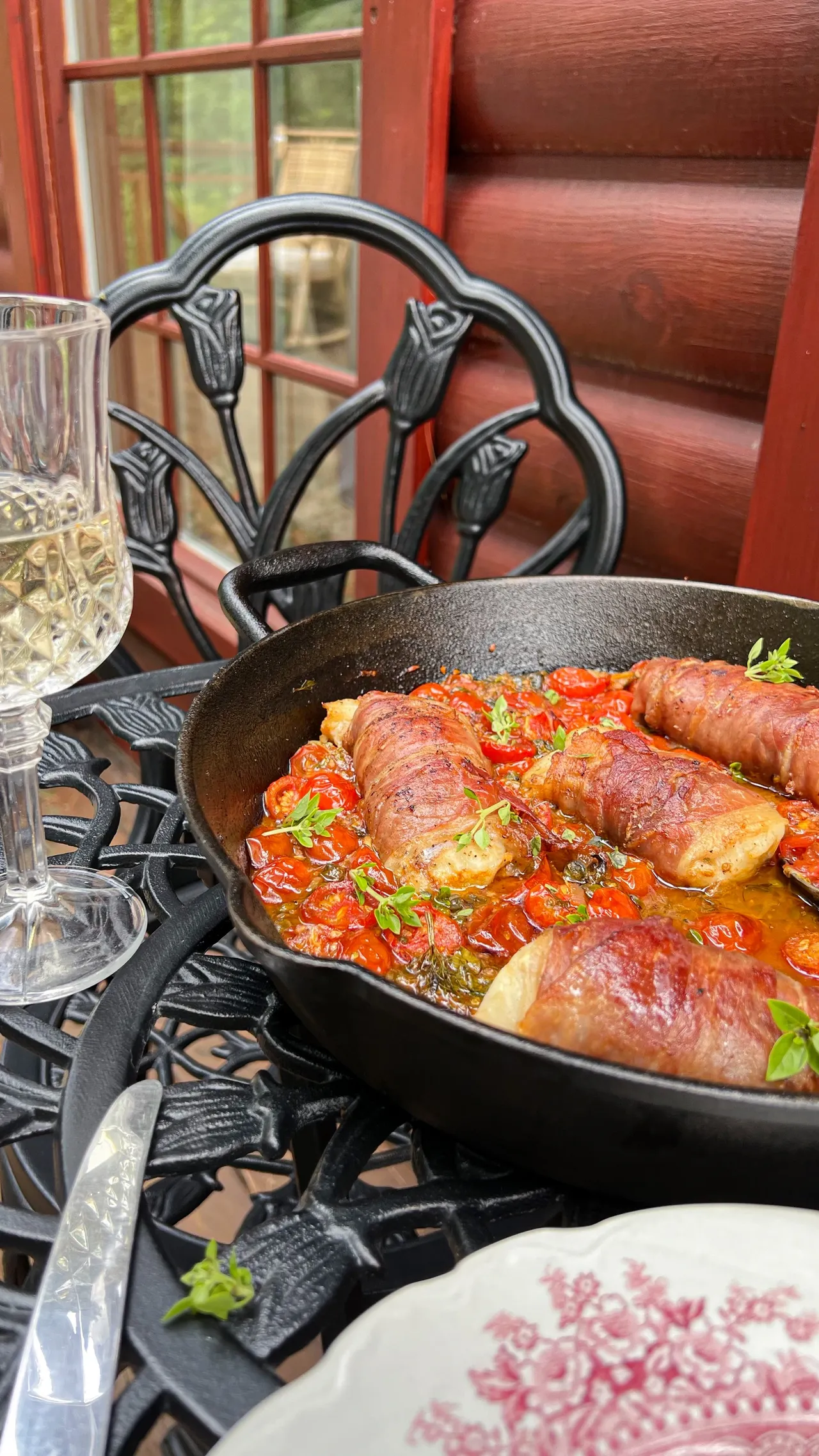 - Enrouler chaque filet de morue avec trois tranches de prosciutto di parma.
