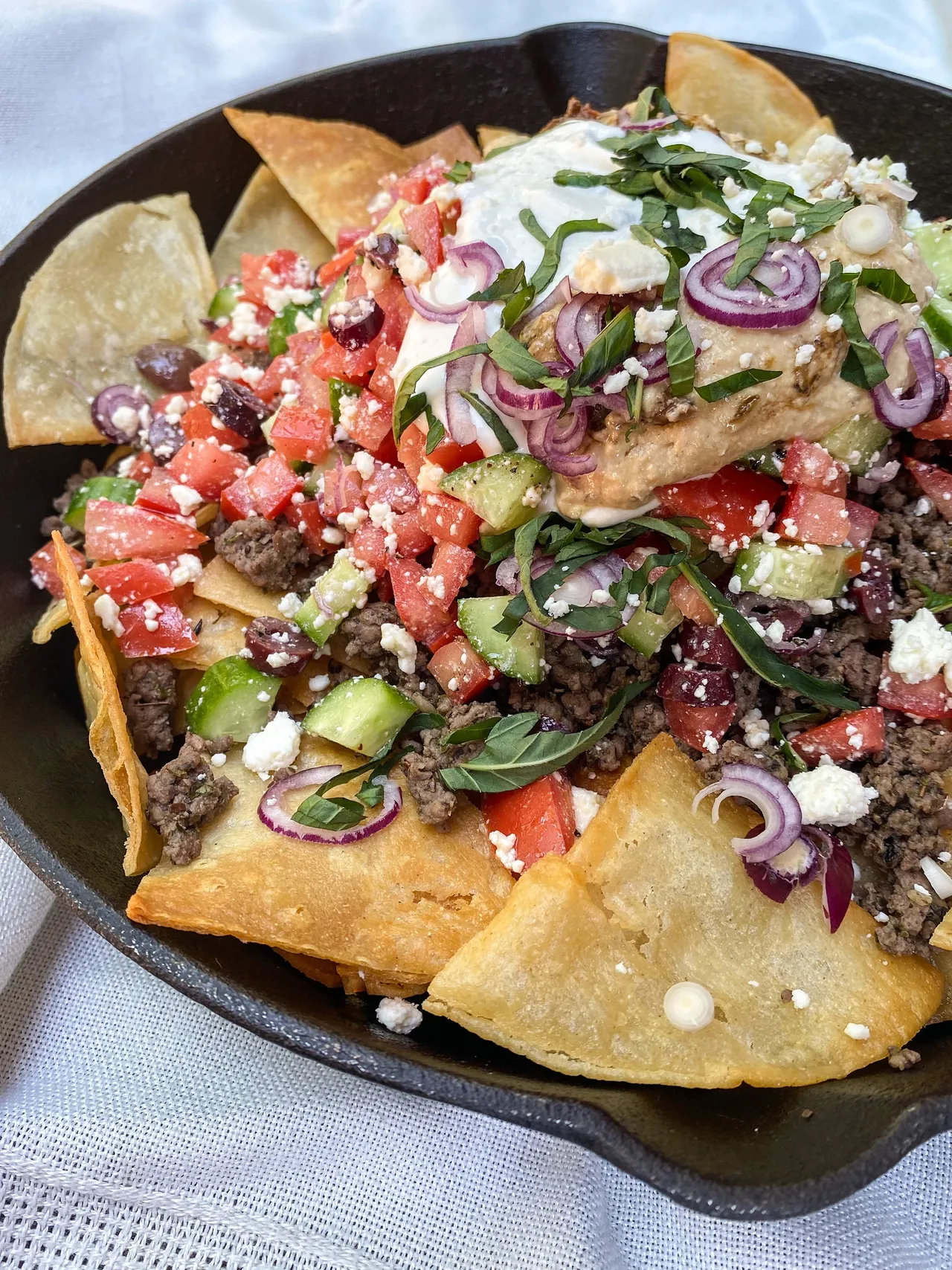 - Lorsque tout est prêt, dans un grand plat, ajouter les chips de tortilla, la viande, puis la salade. Sur le dessus, déposer de la tzatziki, de l’houmous et parsemer avec de la menthe ciselée.