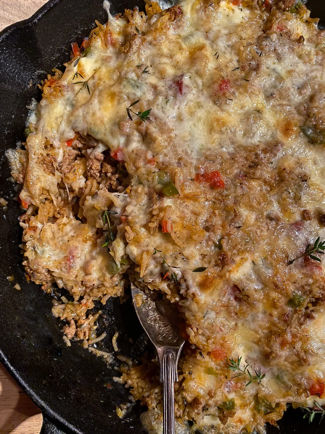 - Lorsque c’est prêt, retirer du feu, mélanger le fromage en grain avec le riz, gratiner avec le fromage râpé, puis terminer la cuisson au four à broil jusqu’à ce que le fromage soit bien doré.