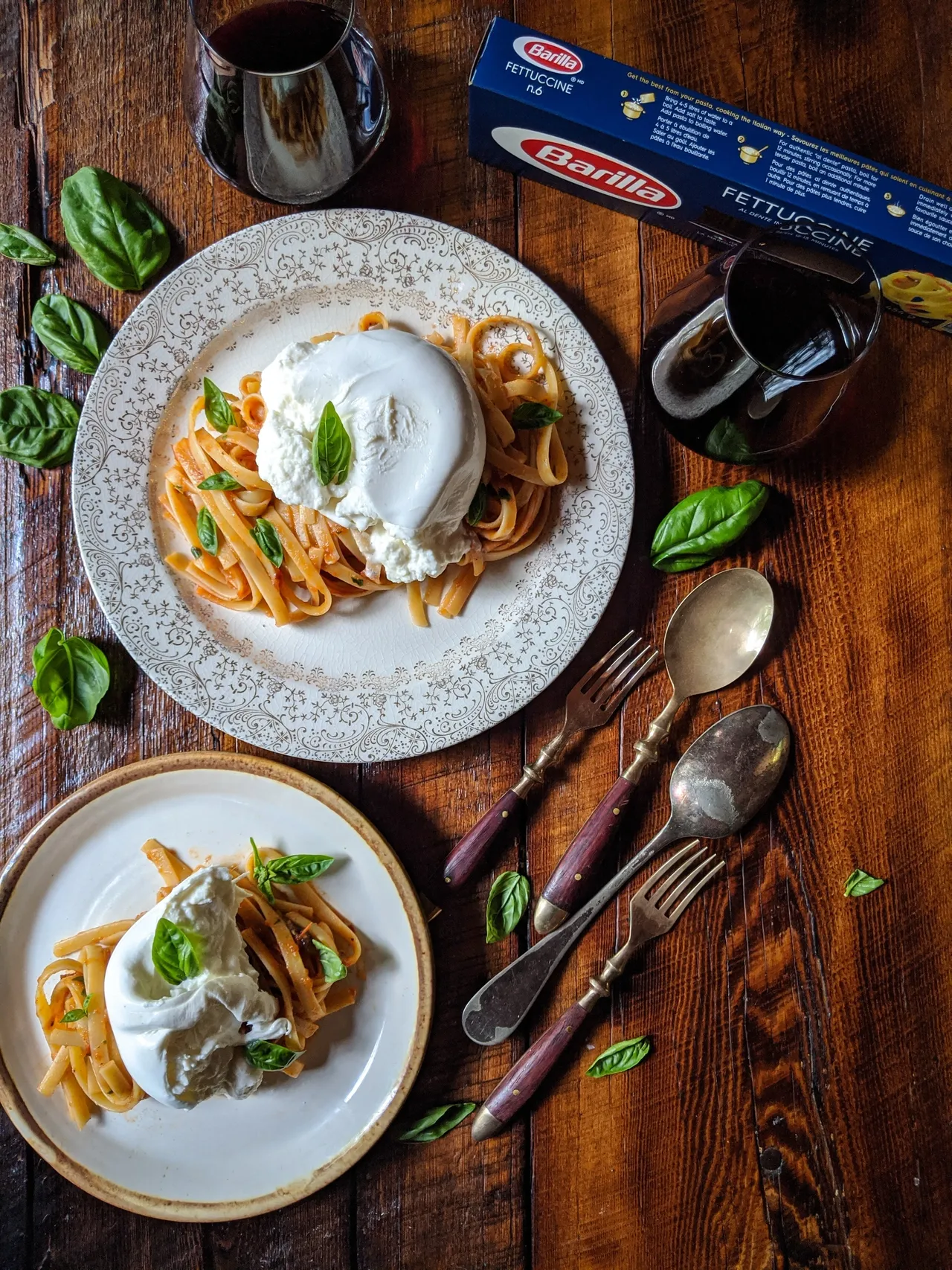 - Servir les pâtes avec encore quelques feuilles de basilic, puis déposer un morceau de burrata sur le dessus.