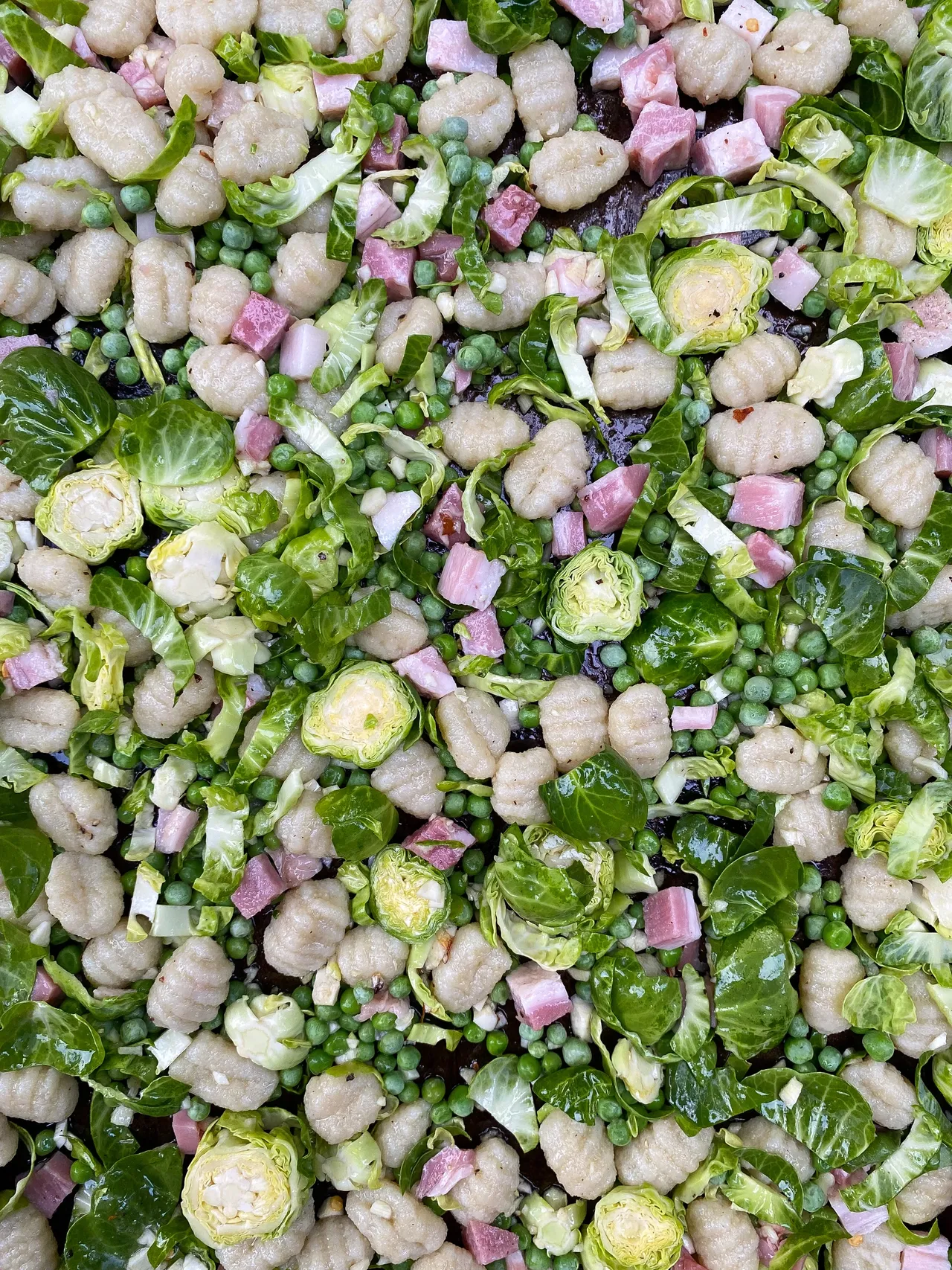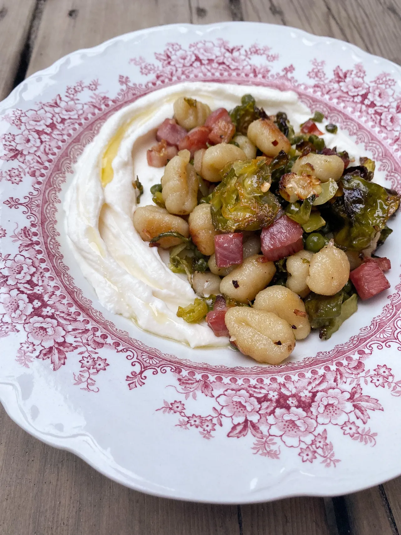 Plaque de gnocchis à la pancetta, Bruxelles, pois verts et ricotta fouettée