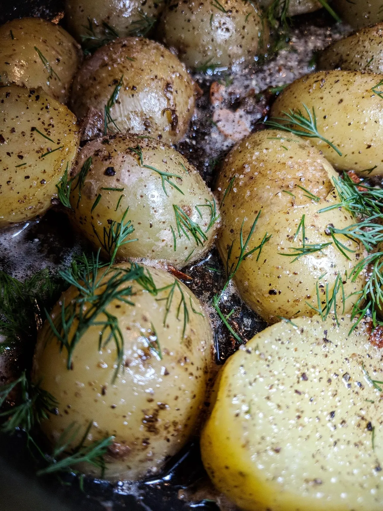 - Retirer du feu et placer les pommes de terre de façon à ce qu’elles soient face à la poêle (voir photo) et enfourner durant 20-25 minutes, jusqu’à ce qu’elles soient bien cuites.
