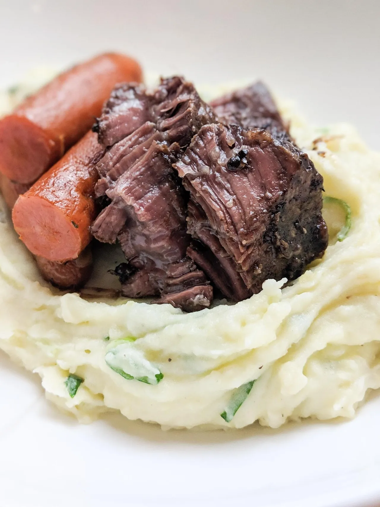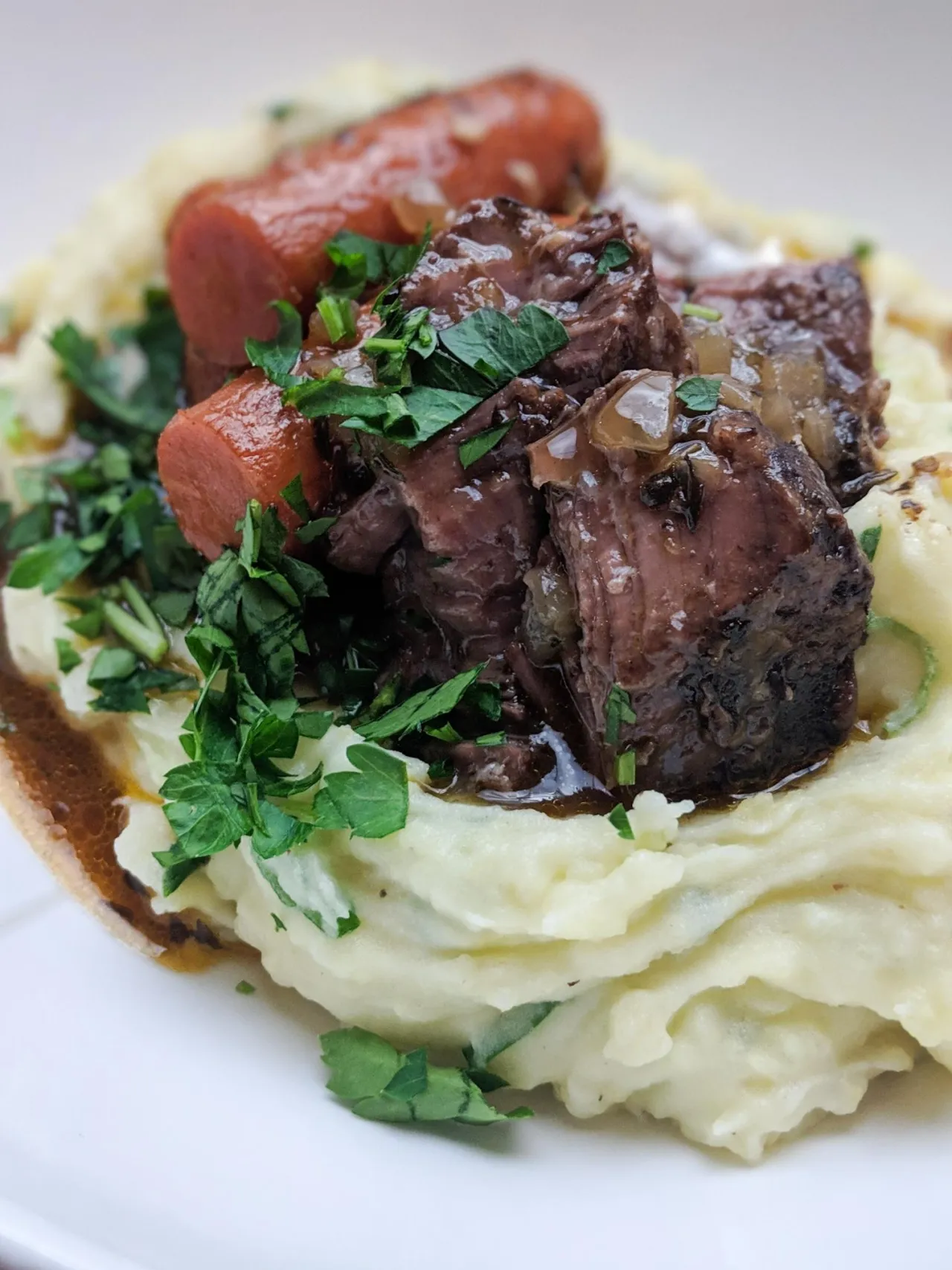 - Servir sur la purée de pomme de terre crème sure et oignons, puis napper le plat avec la sauce.