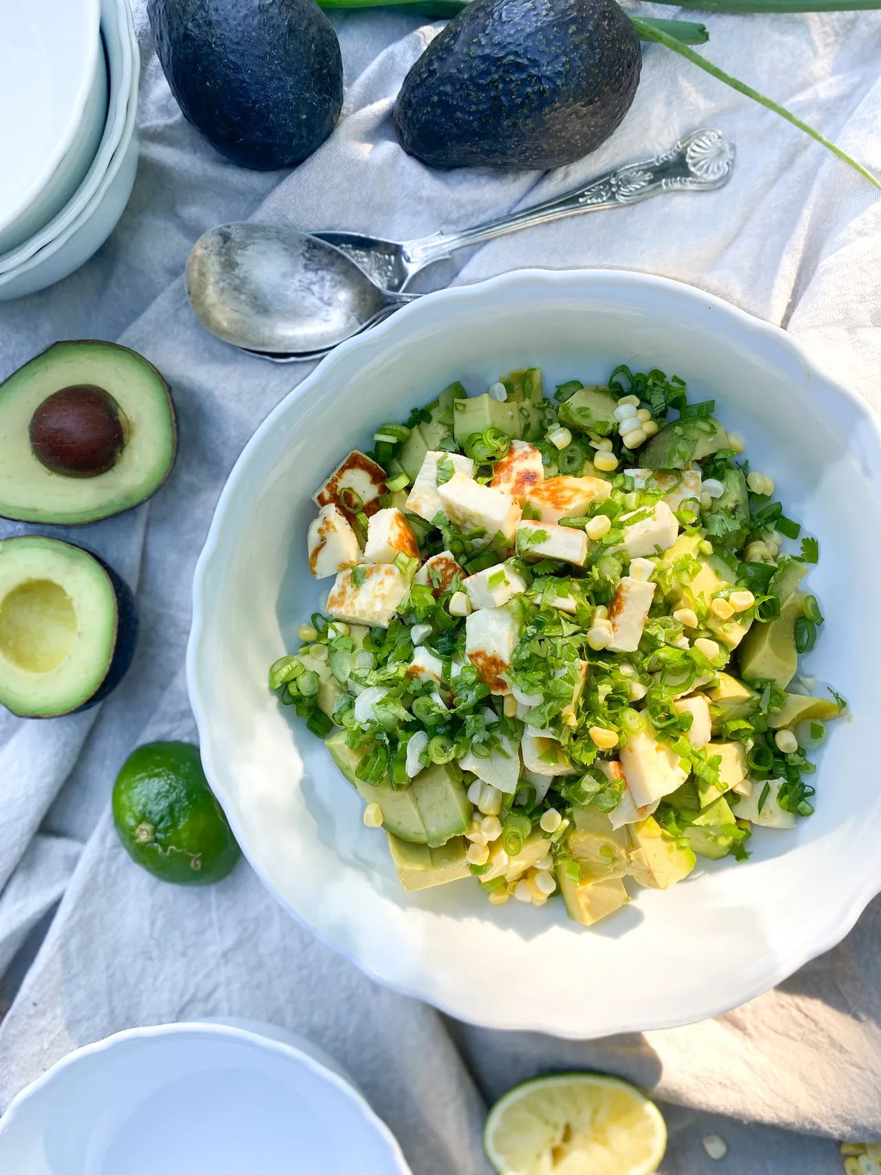Salade d'avocat, maïs et halloumi grillé