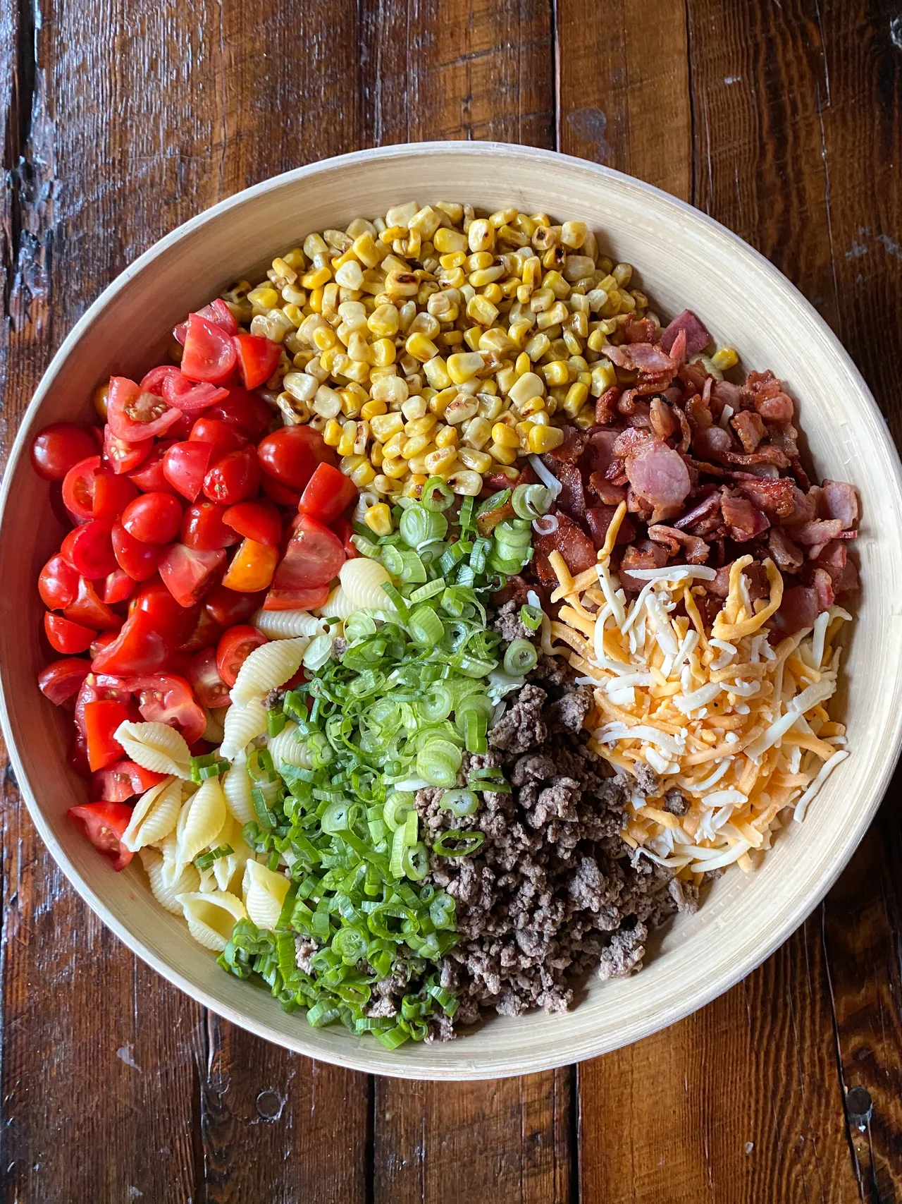 - Lorsque tout est prêt et tempéré, Combiner les pâtes avec le bœuf, le bacon, les grains de maïs, les tomates, le fromage et les oignons verts.