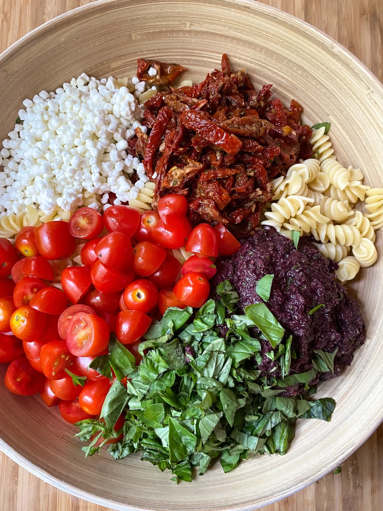 - Lorsque les pâtes ont refroidi, ajouter la tapenade, le sirop d’érable, les tomates, les tomates séchées, le basilic et le fromage de chèvre émietté, puis mélanger jusqu’à ce que les pâtes soient bien enrobées.