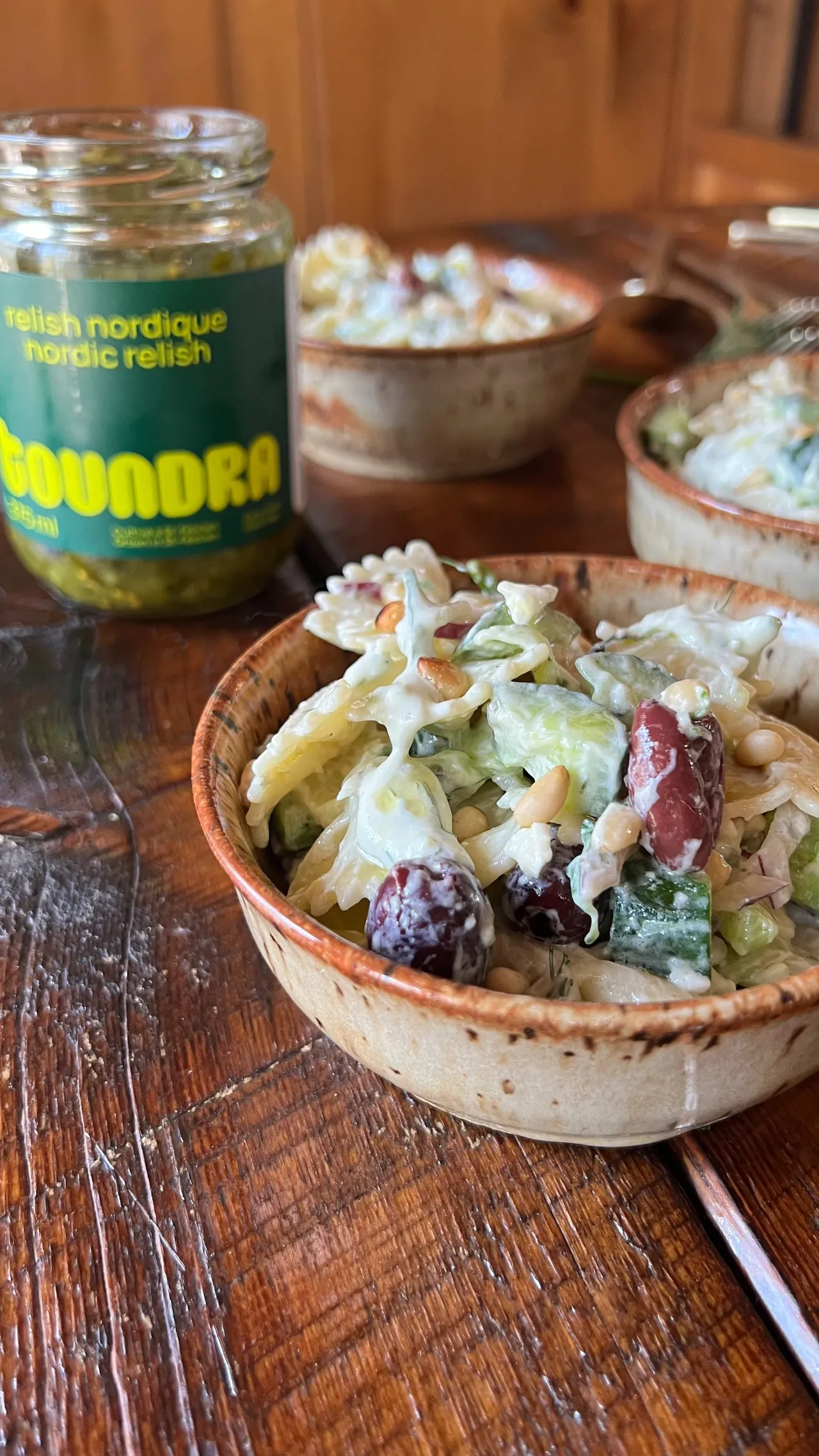 - Lorsque les pâtes sont tempérées, transférer dans un grand saladier, puis ajouter les concombres, les oignons rouges, les olives, les noix de pins et le fromage feta.
