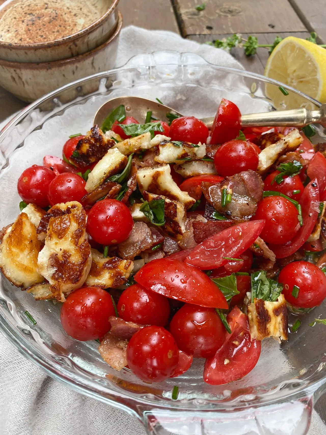 Salade de tomates, bacon et halloumi grillé