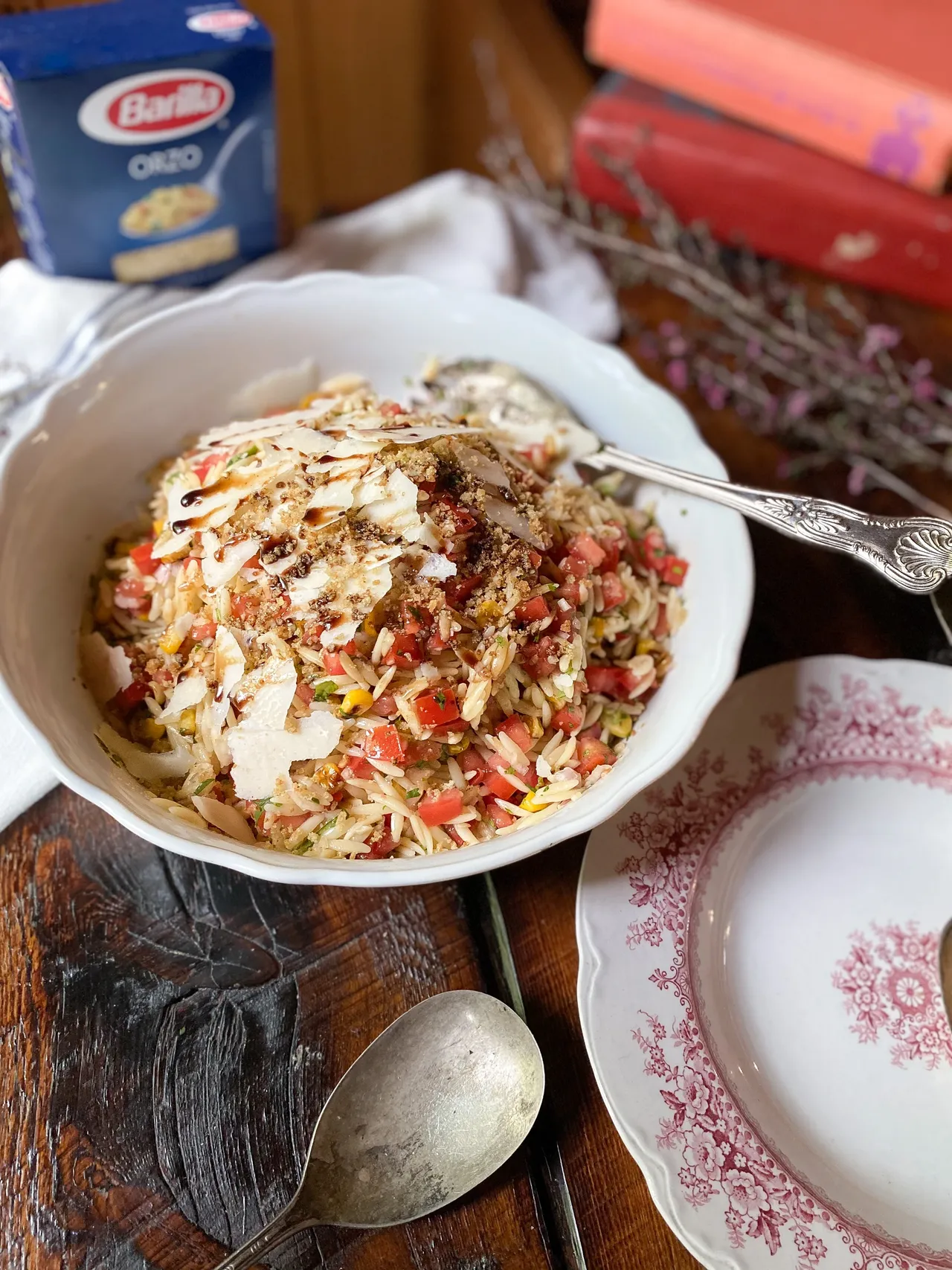 - Dans une casserole d’eau bouillante salée, cuire l’orzo tel qu’indiqué sur l'emballage. Égoutter, puis laisser refroidir.