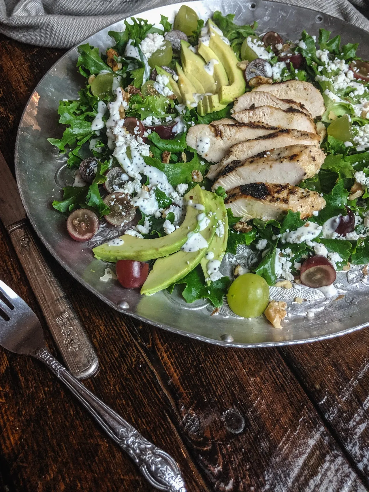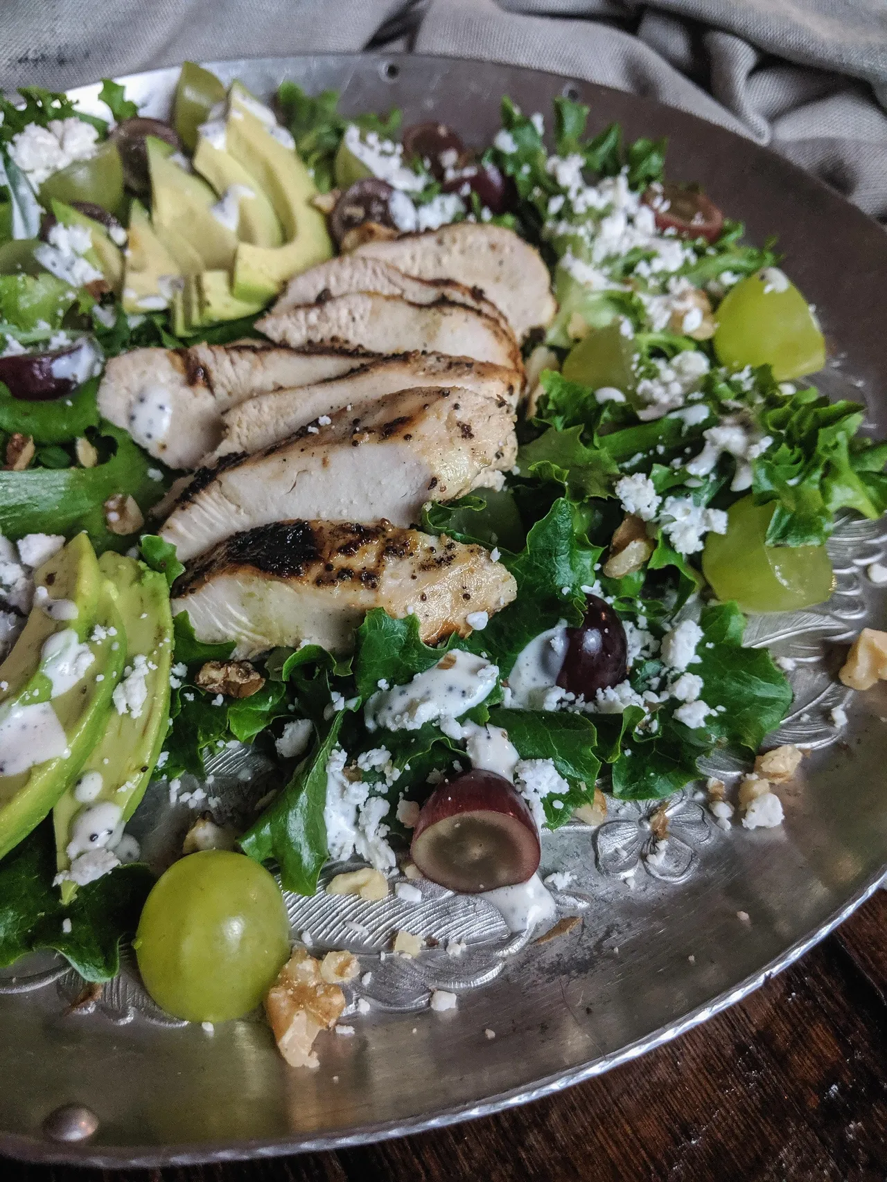 - Lorsque tout est prêt, sans une assiette, déposer la laitue, les avocats, les raisins, les oignons, les noix et la feta. Terminer avec le poulet tranché et la vinaigrette.