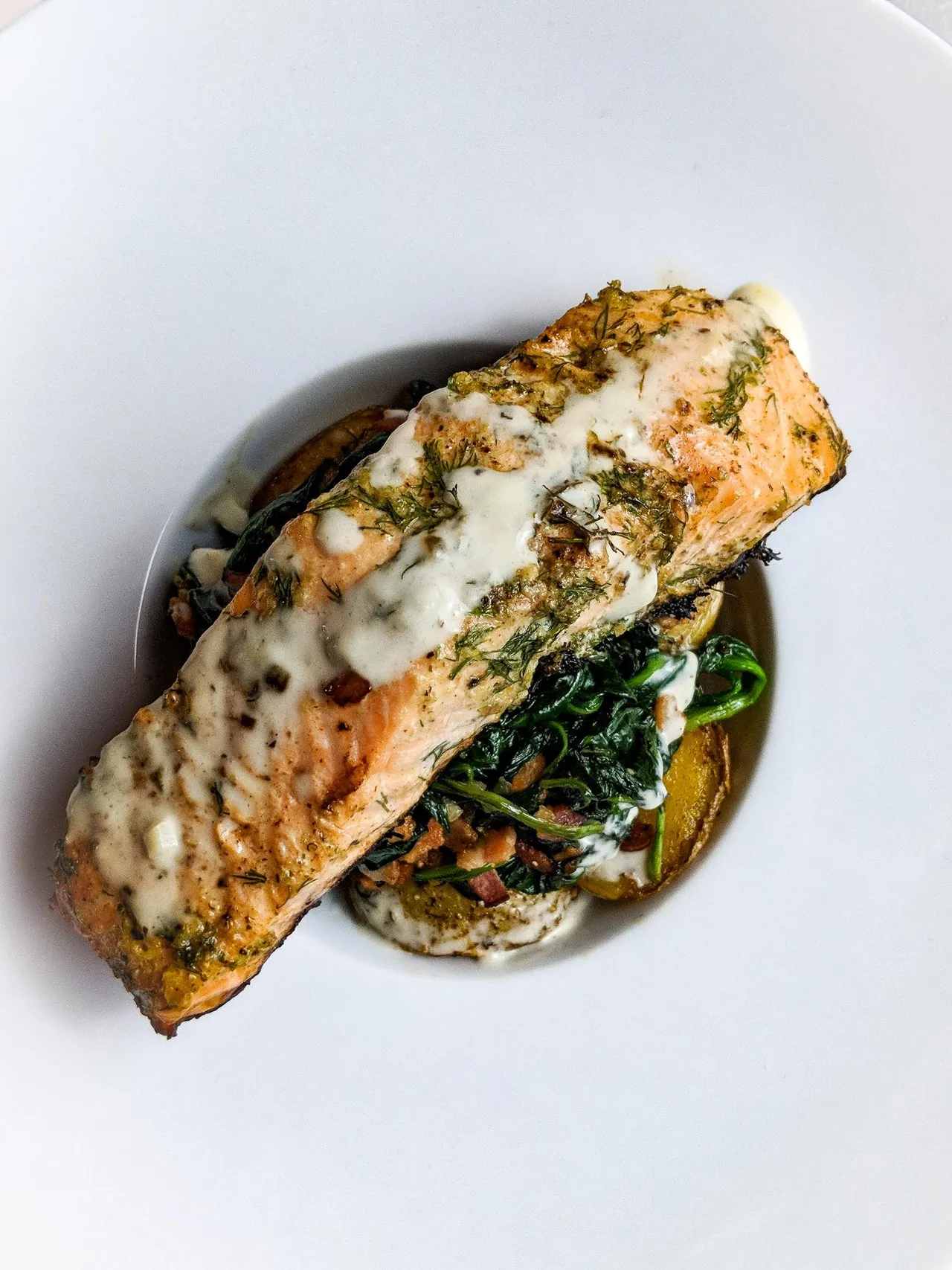 Saumon à la crème au bleu, épinards au bacon et patates rôties