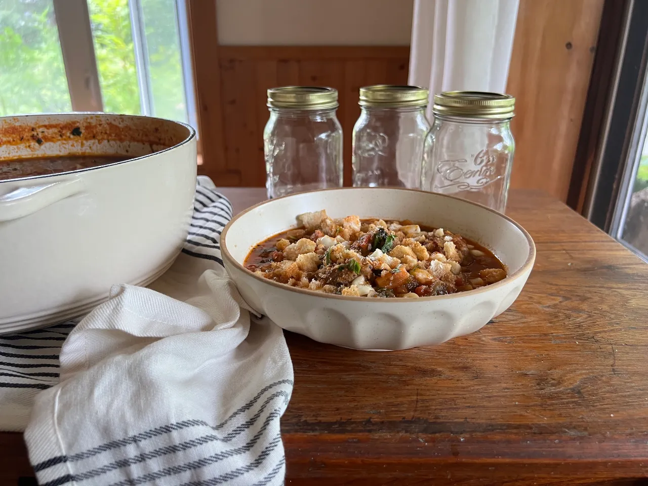 - Servir la soupe en garnissant avec des perles de bocconcini et des croûtons à salade émiettés.