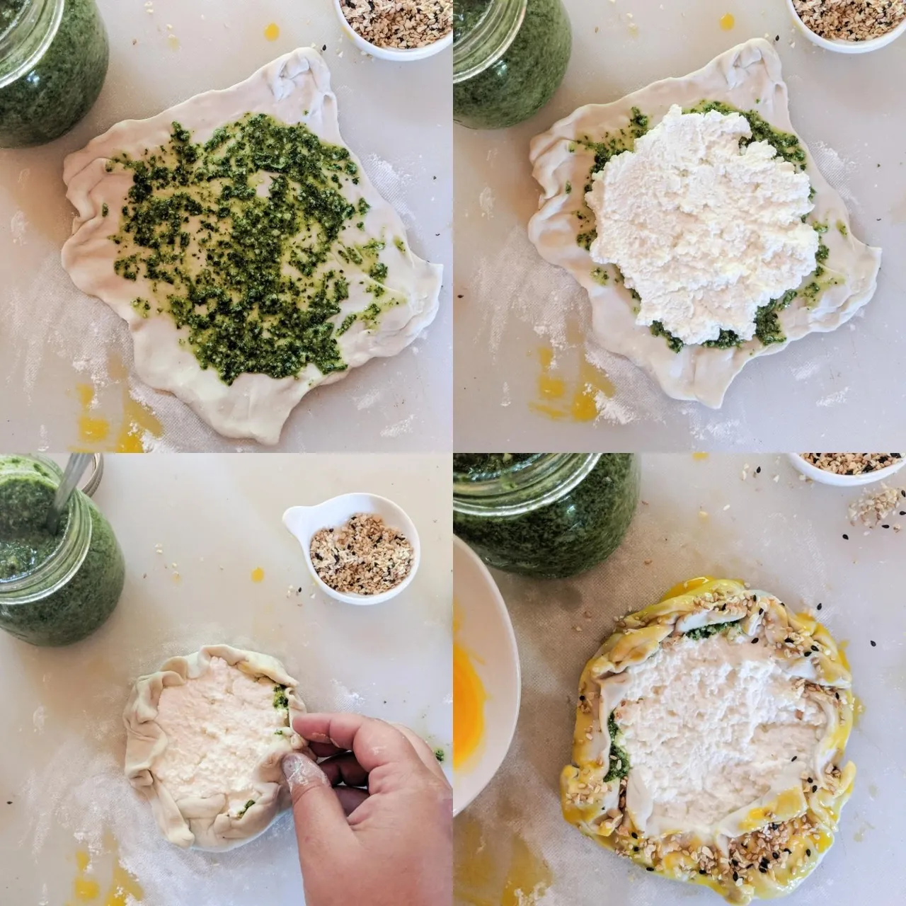 - Rabattre le contour, badigeonner avec le jaune d’oeuf et saupoudrer avec les épices à bagel.