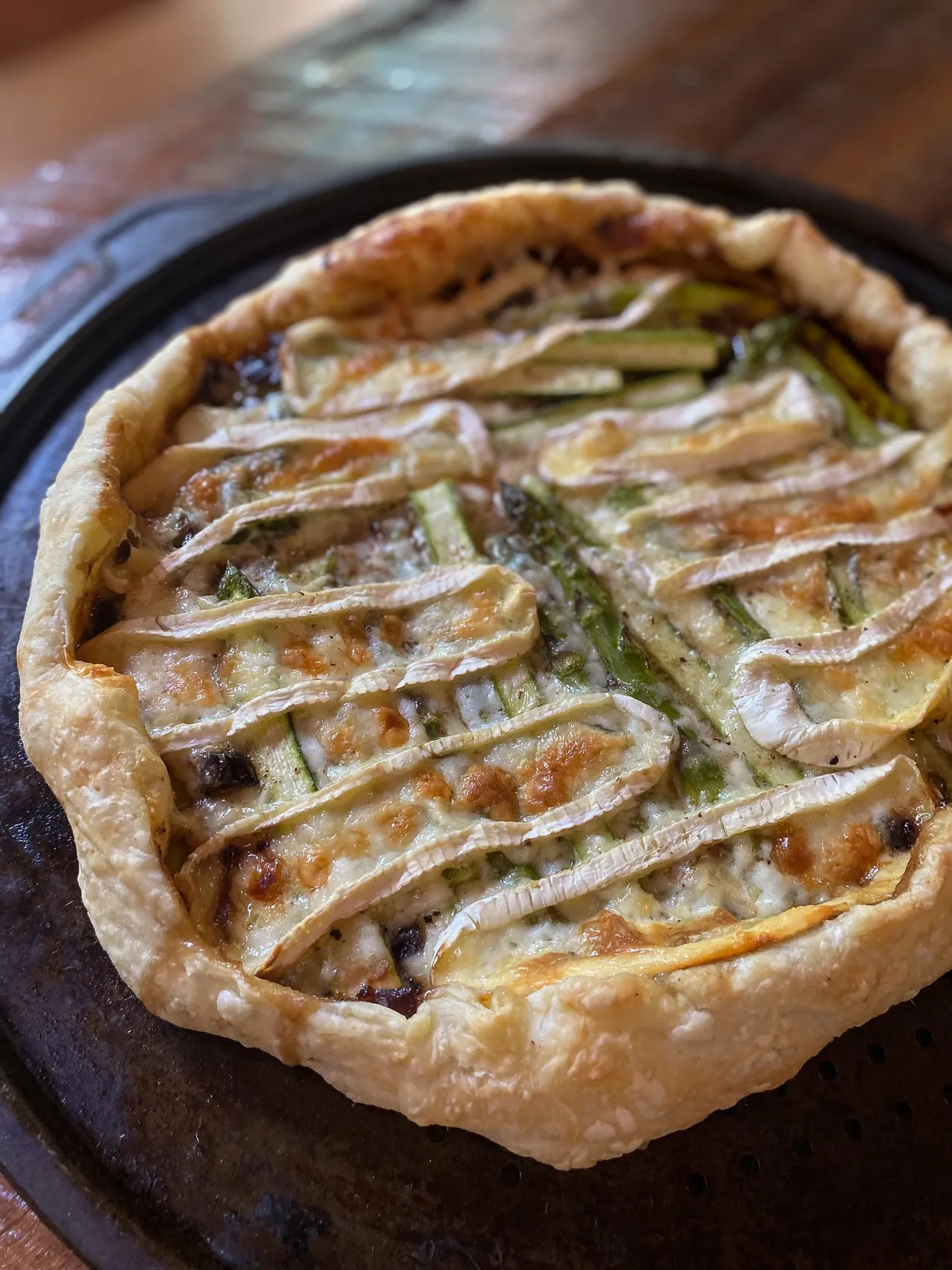 - Déposer les asperges sur la pâte en laissant environ 1 pouce de distance sur le contour, puis terminer avec les tranches de brie.