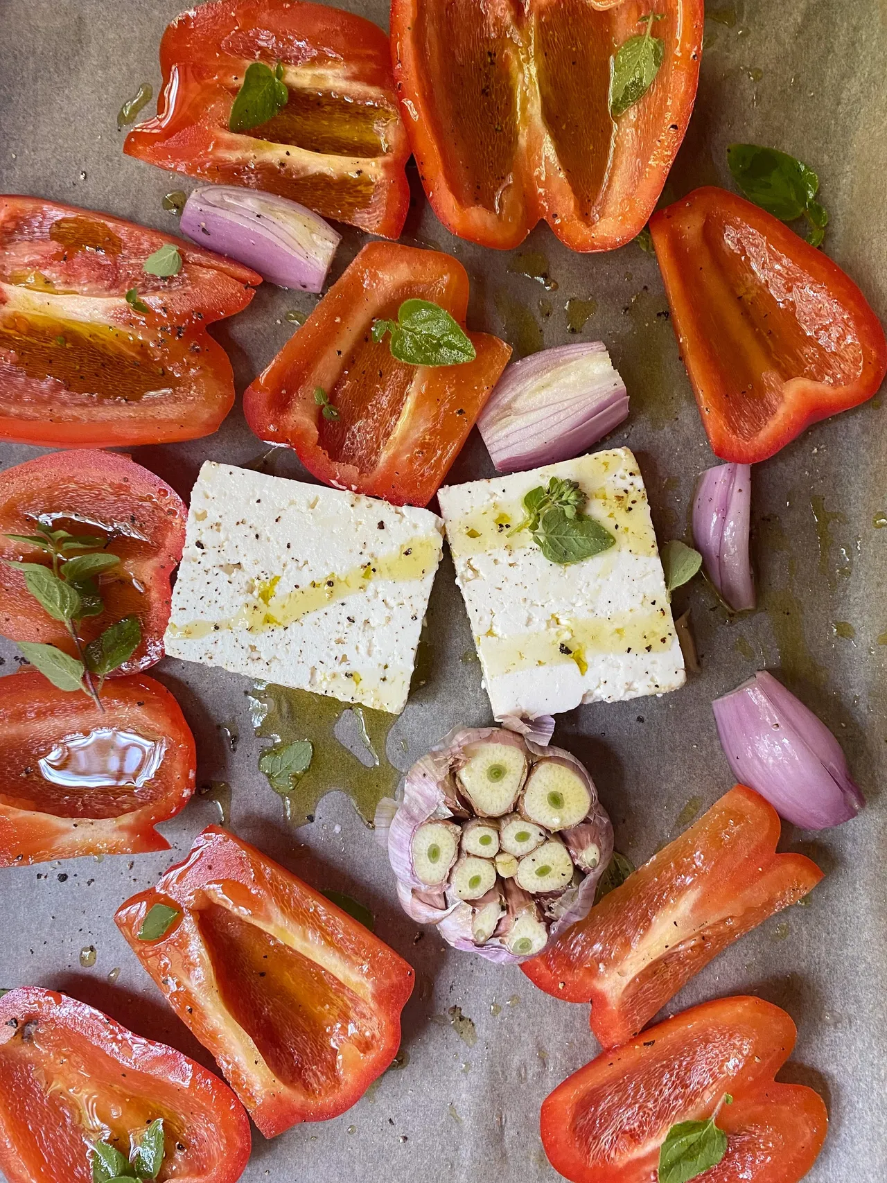 - Sur une plaque à cuisson muni d’un papier parchemin, déposer les morceaux de poivrons, les échalotes, le bulbe d’ail et le fromage feta. Saler et poivrer.